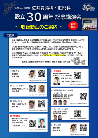 おかげさまで、佐井胃腸科・肛門科は本年で設立30周年を迎えます。これを記念し、9月23日に記念講演を開催いたしました。 おかげさまで当日は会場を埋め尽くすほど多くの方にご参加いただき、心よりお礼申し上げます。 講演会の収録動画を作成いたしました。 下記URLよりご視聴いただければ幸いです。 1)https://youtu.be/pPcuATqAps8 2)https://youtu.be/-qXQHc0KAkk 3)htthttps://youtu.be/W34ux2oWybo 4)https://youtu.be/7E0CePxBRu8 5)https://youtu.be/xQ3ed_Oo9IY 6)https://youtu.be/PXHewIDBiyM 7)https://youtu.be/xRuXl99EKjY 8)https://youtu.be/7tYjCKkoRtA |